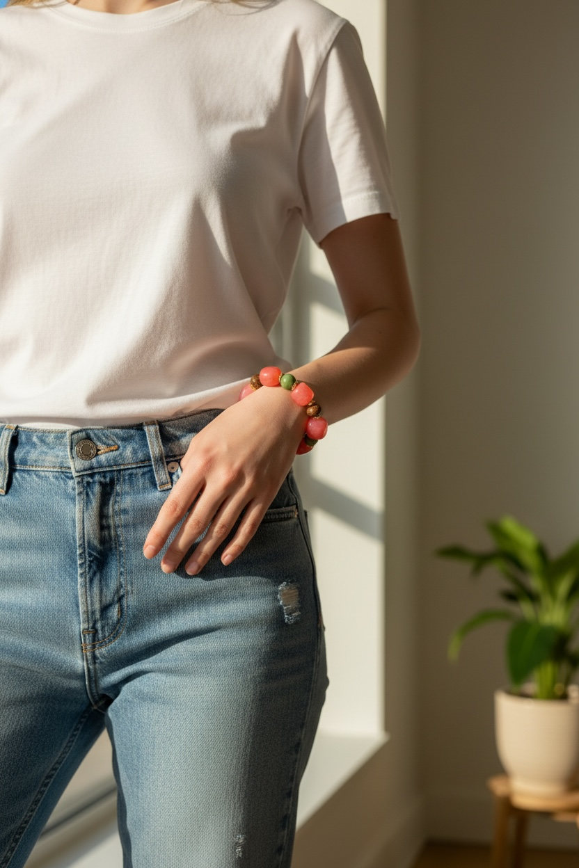 Ses perles aux nuances corail vibrantes, subtilement associées à des touches de vert profond et de rose poudré, créent un équilibre parfait entre douceur et caractère.